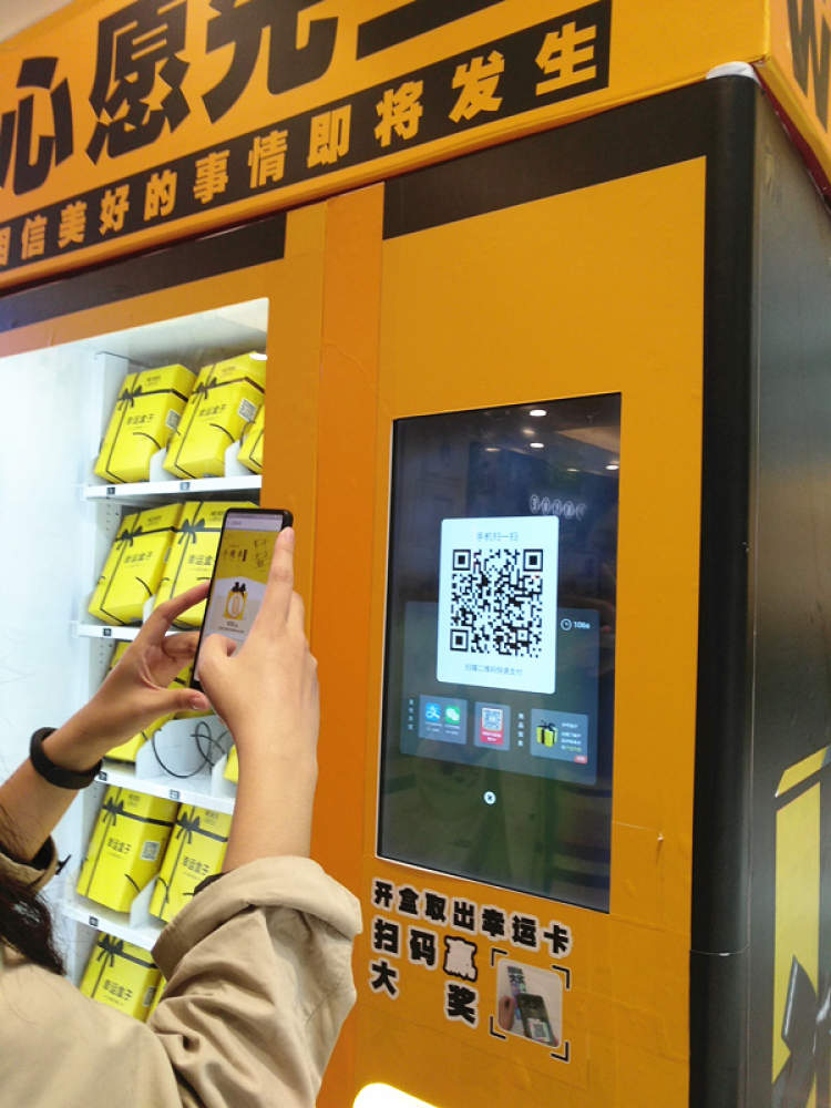 顾客:你选一个盒子,然后屏幕上会跳出付款码,你直接扫码支付30块,就会掉下来一个幸运盒子。