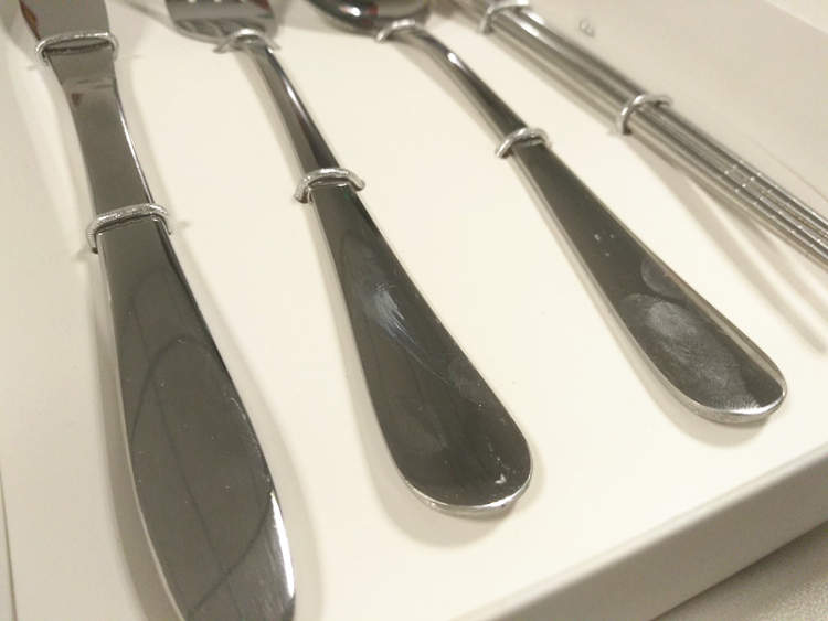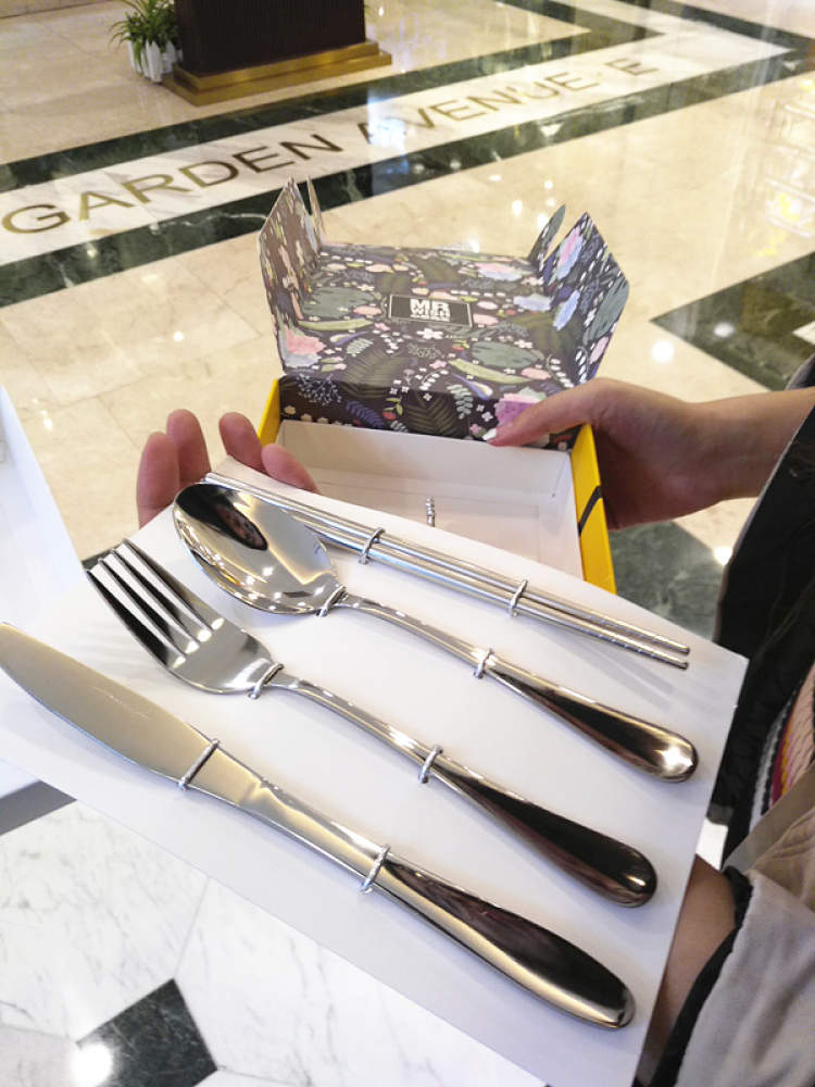 仔细一看,餐具上面有不少刮痕,一看就是廉价货,拿回办公室,同事好奇地按照上面的牌子去某宝上搜索,结果连同款都查不到。