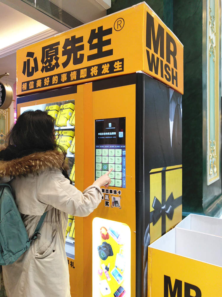 近日,小哥在环球港吃午饭,发现地下二楼有一种叫“心愿先生”的机器。只需花30元扫码,消费者就有机会赢得手机、拉杆箱、相机、拍立得、游戏机等奖品,去玩的人还不少呢!