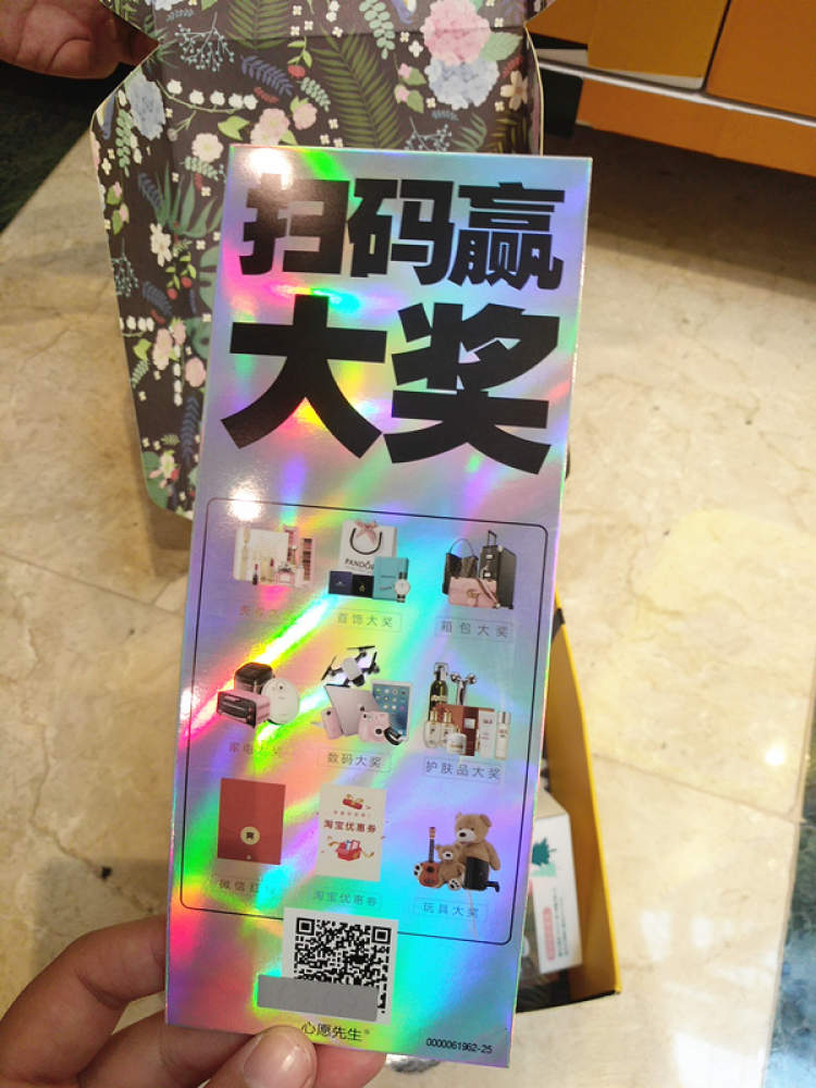 等等,她好像还发现了一个赢大奖的机会,盒子里还放了一张扫码赢大奖的卡片,有机会赢得美妆、首饰、箱包、家电、数码、护肤品、玩具等各类大奖,不少奖品从图片上还都是奢侈品级别呢!