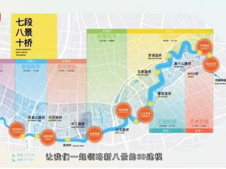 结合苏州河两岸不同功能内容,规划为七大区段。自东向西分别是: