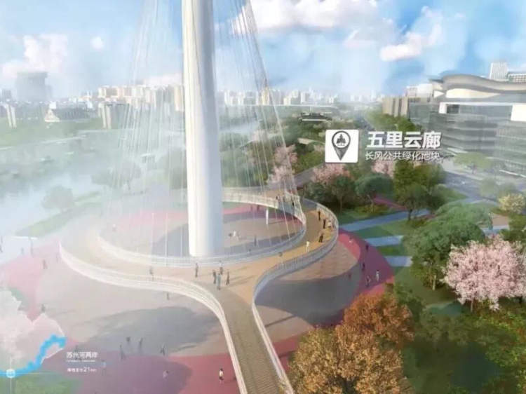 基地位于长风绿地区域利用空中连廊,将长风公园,儿童图书馆,长风1号绿地,码头俱乐部,以及长风绿地标志塔连接起来,打造滨水绿地与城市空间重要节点的无缝连接;除了空中长廊,在其他绿地之间利用地面走廊,将各个绿地斑块进行串联,打造全天候休憩空间。