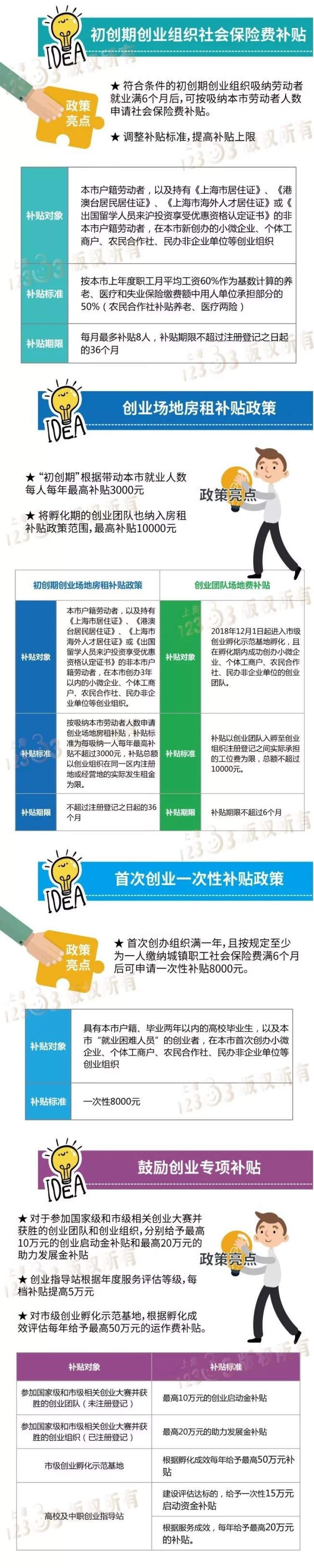 本月起,本市相关创业扶持政策全新升级,从补社保、补场租、补载体、补首次创业等方面加大创业扶持力度,打造创业带动就业政策“升级版”,进一步放宽了对象范围,进一步提高了有关补贴标准或补贴上限。