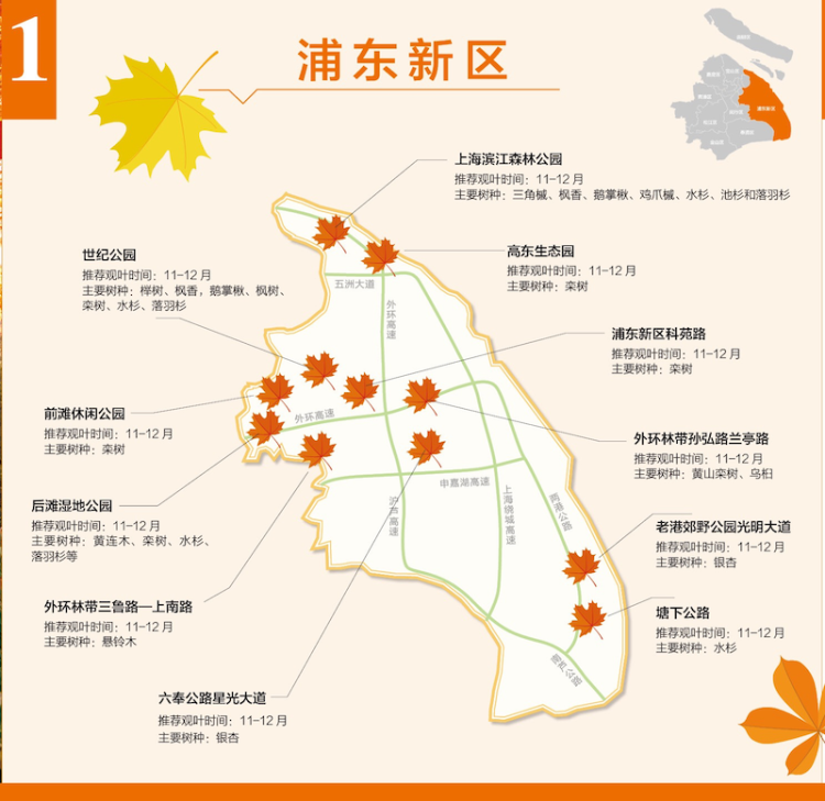 正是魔都最美的季节。今天,市林业总站发布了上海首份红叶郊区地图,地图标注了银杏、无患子、乌桕、黄连木、娜塔栎等色叶树在崇明、宝山、金山等9个郊区的主要观赏地点。专家介绍,随着冷空气的来临,昼夜温差加大,将有助于树木变色,但好看的树叶能在树上挂多久还要取决于天气,若是遇到大风,可能一夜之间就会飘落。