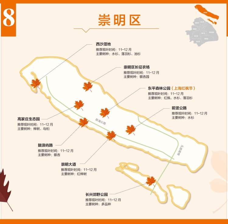 由市林业总站制作的这份红叶郊区地图是上海林业部门首次发布的红叶地图。所谓“红叶”只是名字而已,其实是一份彩叶地图,图上囊括了银杏、无患子、栾树、乌桕、枫香、娜塔栎等色叶树在崇明、宝山、金山、嘉定等9个区的主要观赏地点。