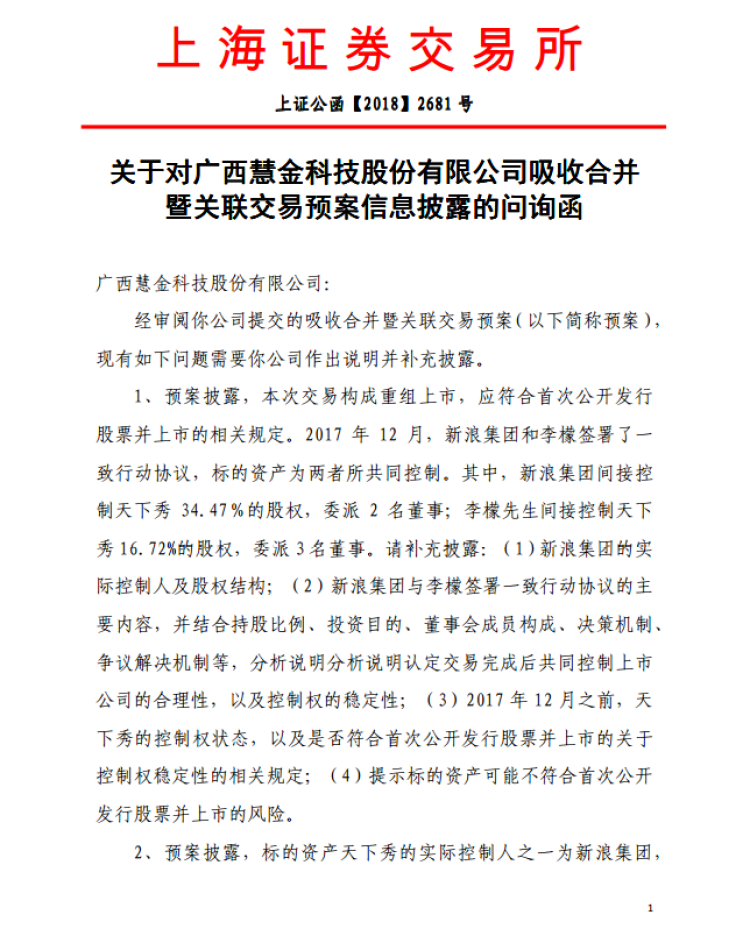 对此,公司披露交易当天就收到上交所问询函,4日上交所再次发函,称ST慧球预案披露,标的资产天下秀的实际控制人之一为新浪集团,标的资产主要通过与新浪微博等平台的合作从事互联网营销业务。请补充披露:(1)标的资产的经营和盈利是否严重依赖新浪微博等股东的资源,并结合前述情况充分说明其业务独立性;(2)新浪集团旗下是否具有从事互联网营销等相类似及相关业务的资产,是否存在同业竞争的情形;(3)结合前述情况说明标的资产是否符合IPO关于独立性的相关规定等。