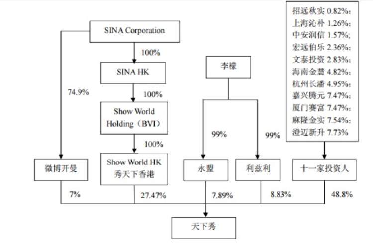 天下秀是一家主要依赖新浪微博的新媒体营销服务公司,成立于2009年,法人代表为李檬。其中,新浪集团间接控制天下秀34.47%股权,李檬间接控制天下秀16.72%的股权。2017年12月,新浪集团和李檬签署了《一致行动协议》,成共同控制人。