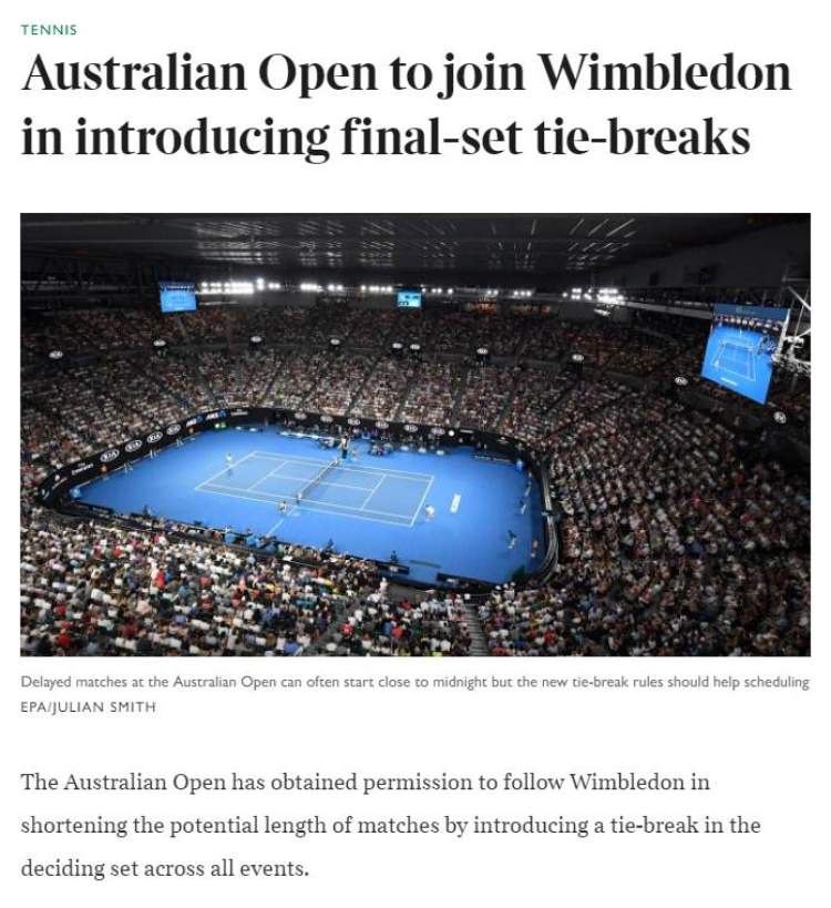 据今天英国《泰晤士报》的消息,继10月温网做出妥协后取消无休止长盘后,澳网也决定引入决胜盘抢七规则,但和温网打到决胜盘12-12之后才抢七不同,澳网的规则是决胜盘战至6-6之后,打一个先到10分为胜(净胜2分)的超级抢七,也就是“抢十”。新规则最快可能从2019年就正式采用,由于时间较紧(距离比赛仅剩一个多月),也有可能从2020年开始启用。
