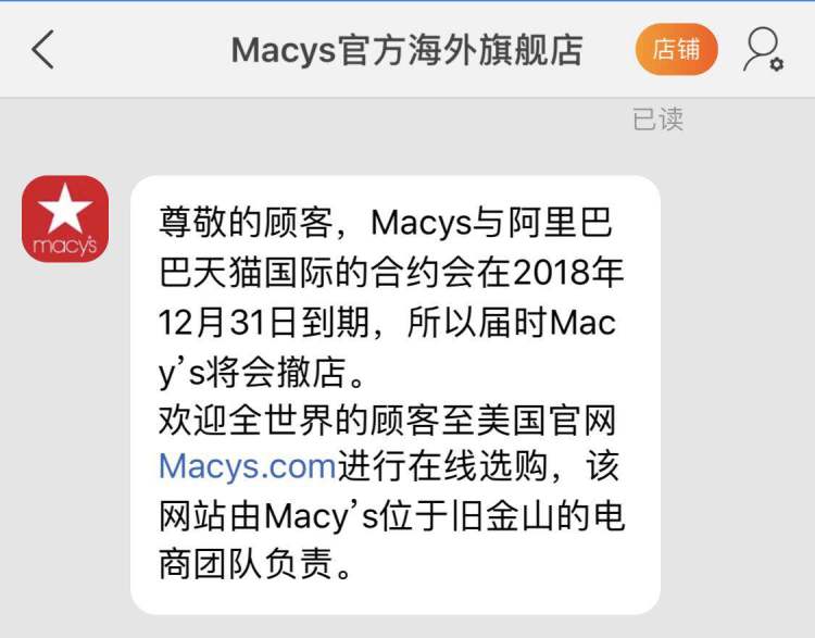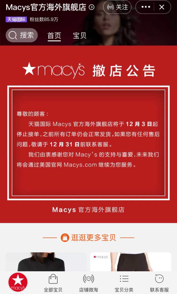 天猫国际Macys官方海外旗舰店已于12月3日起停止接单,此前的订单会照常发货,售后问题需于12月31日前联系客服。记者在询问时,客服回应称,Macys与阿里巴巴天猫国际的合约会在2018年12月31日结束,所以届时将会撤店。