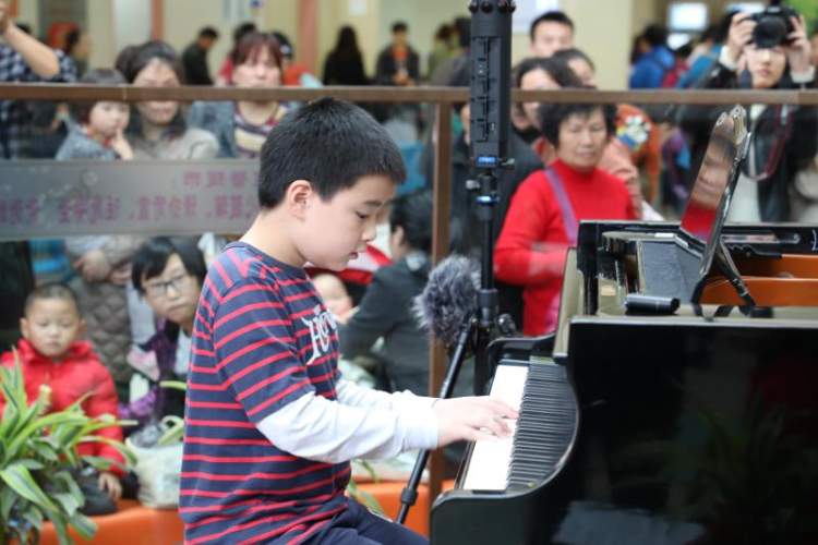下午15时,儿科医院二楼候诊区突然响起优美动听的钢琴曲,《水草舞》、《致爱丽丝》、《F大调小奏鸣曲》……六位儿科医院曾经的小患者如今成为小小志愿者,现场弹奏起动听的钢琴曲目。现场众人,有好奇观看,有循声而来,很快,把钢琴四周围个水泄不通。