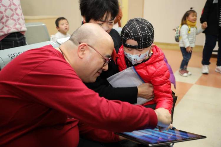 正在医院等待就诊,突然有位神秘人物走到患儿身边拿起他们幼小的手指,轻触ipad屏幕的同时,欢快的曲调随之传出。