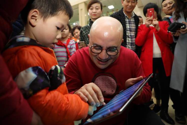 孔祥东手捧iPad突然出现在现场,不时在人群中蹲下,拿起小患儿的手“玩”起新媒体音乐,欢快的曲调随之传出,也为小患儿打开了一扇音乐之门。在孔祥东看来,“音乐不需要学习,每个人都是天生的音乐家,都可以创造出属于自己的音乐。”