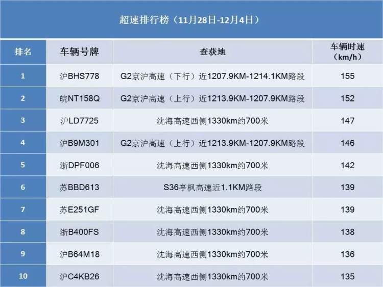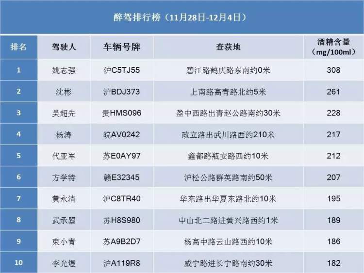 上海交警公布每周醉驾、飙车名单:血液酒精含量达“醉驾”标准近4倍还在开车! 荣思嘉 2018-12-05 来源:周到上海 为进一步落实公安部交通管理局冬季道路交通事故预防专项行动,上海市公安局交通警察总队严整严治酒后驾驶、超速驾驶等严重交通违法,现就近期查获醉驾、超速名单进行公开曝光,以警醒交通参与者。 十大醉驾名单(点击下方看大图) 十大超速名单(点击下方看大图) 来源:周到上海 作者:荣思嘉 赞一个 (0)