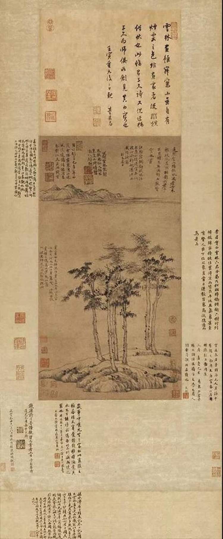 还有“元四家”之一的倪瓒《六君子图》,一幅画上画了六种树木,各有象征意义。当时倪瓒经历了家中巨变,变卖家产后云游四方,当起了隐士。他在河上游览美景之后略有点困意,结果碰到卢山甫打着灯笼拿着纸找到他,求他画画。拗不过人家,倪瓒只好在困倦中完成了此作,居然流芳百世。这幅画实在太好,以至于黄公望、王铎、董其昌等当时名流纷纷在旁边题跋发弹幕点赞。于是成就了一幅信息量极为丰富的传世名作。