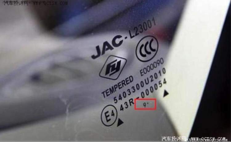 汽车玻璃一般都会在玻璃下沿(侧面玻璃和风挡玻璃)标注生产日期,侧窗玻璃上会有下图中这种数字加黑点的标注,数字为年份,黑点为月份,黑点在前用7减去黑点数量;黑点在后,用13减去黑点个数,得出的即为月份。