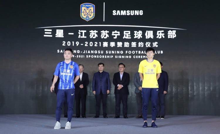 相比之前战袍最大的不同,在于新球衣胸前和背后都印上了“三星(Samsung)”的字样,而这家韩国企业也将在2019至2021赛季成为苏宁俱乐部的顶级赞助商。昨晚在南京徐庄苏宁总部,举行了盛大的“三星——江苏苏宁足球俱乐部2019-2021赛季赞助签约仪式”,苏宁控股集团董事长张近东和三星电子移动通信部门总裁高东真都参加了此次签约仪式。