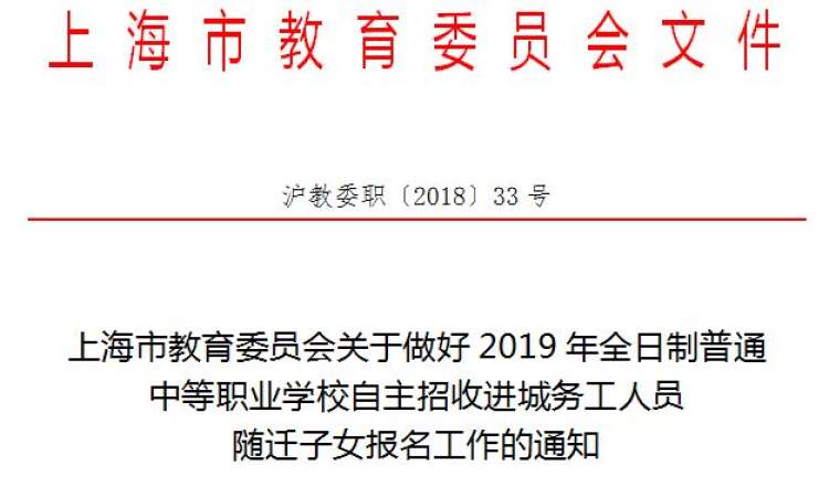 上海市教委最新公布了2019年本市全日制普通中等职业学校自主招收进城务工人员随迁子女报名工作的通知。