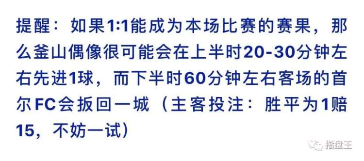 这两支韩K联队伍都蛮给面子的,果然釜山偶像在上半时23分钟先入一球,而下半时59分钟时首尔FC扳回一城,其实我的功课做得还是蛮细致的,很多比赛数据都会记录下来,包括进球时间,至于昨天这种“猜得神准”的情况会鼓励我以后“大胆”的把知道的“情况”“大声说出来”,哈哈哈……