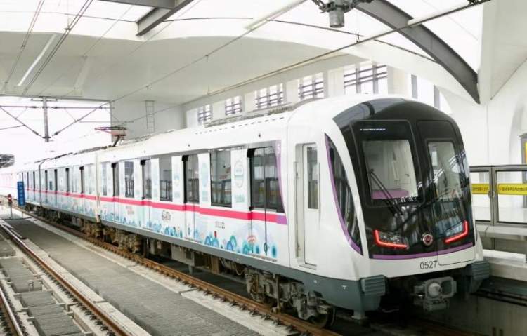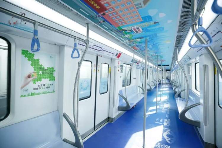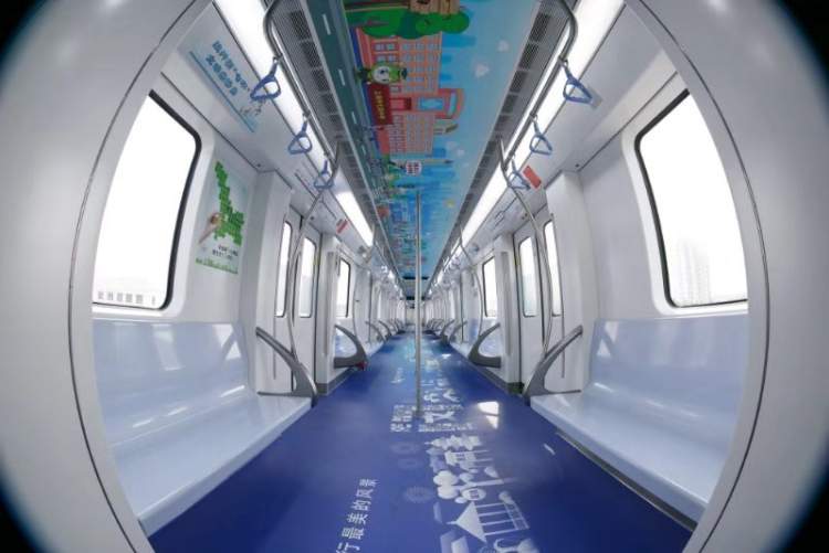 值得一提的是,该列车将2018年闵行区公益广告设计大赛的获奖作品刻画于身,将艺术与文明深度融合,成为名副其实的移动风景线。列车外部车身的青色背景中还融入了众多抽象的闵行地标性建筑,有七宝塘桥、交大华师大、旗忠网球中心。车内天顶有以深受闵行青少年喜爱的“创全”吉祥物“美美、好好”为主角绘制而成的上海市“新七不规范”宣传长卷。
