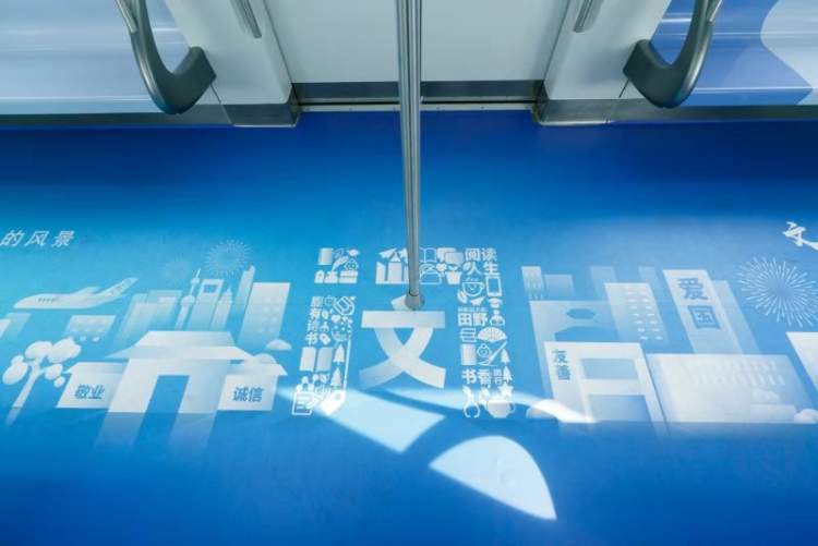 车厢内用社会公德、职业道德、家庭美德、个人品德等广告语组合成的“闵”字铺满地面,营造出闵行浓浓的“创全”氛围。此外,列车车厢中还展示了“寻找改变的你”文明修身活动的海报,内容包括修身打卡及文明传习周播剧展映,也吸引了众多市民热心参与。