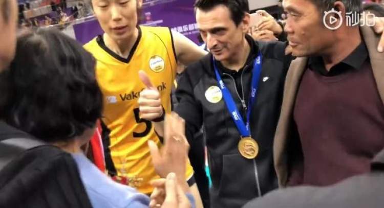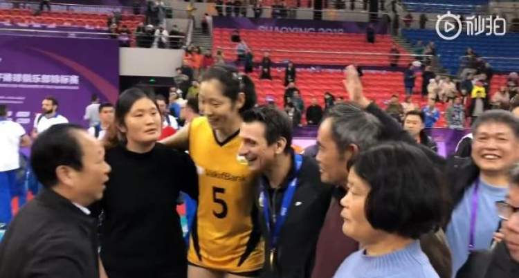 比赛结束后,朱婷主动把自己的父母介绍给古德蒂,这位土耳其教练一把搂住了朱爸爸和朱妈妈,非常亲切地向朱妈妈伸出了大拇指:“Very good”。