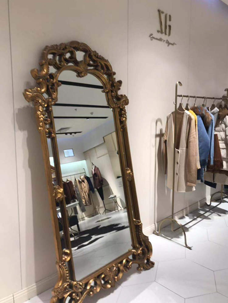 在女装区,记者看到,多家商铺采取了将镜子倚墙斜靠的安放方式。以此方式放的镜子大多体积较大,装饰较繁复。部分镜子可高达3米,宽达1米,厚度达10公分。然而,倚墙斜靠的安放方式,让这些镜子大部分处于悬空状态,仅最上端与墙体紧密相连。不过,在镜子与墙体相连的支点位置,商家多采取了一定措施对镜子进行了加固。