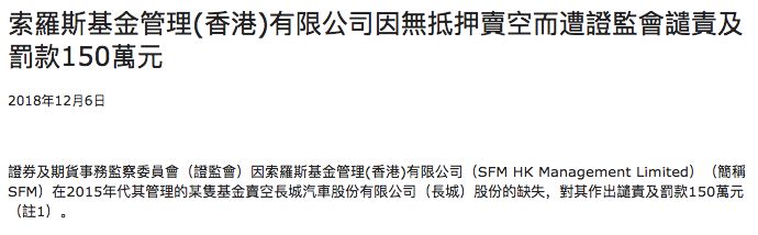 上周四,索罗斯基金管理公司因无抵押卖空遭到了香港证监会罚款150万元。