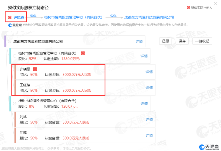 天眼查信息显示,成都东方闻道科技发展有限公司成立于2000年,注册资本1500万,樟树市博闻投资管理中心(有限合伙)持有92%股份,章树市明道投资管理中心(有限合伙)持股8%。王红接和许晓霞夫妇每人持有博闻投资50%的股份,刘林和江鹏也是各自持有50%的明道投资股份。