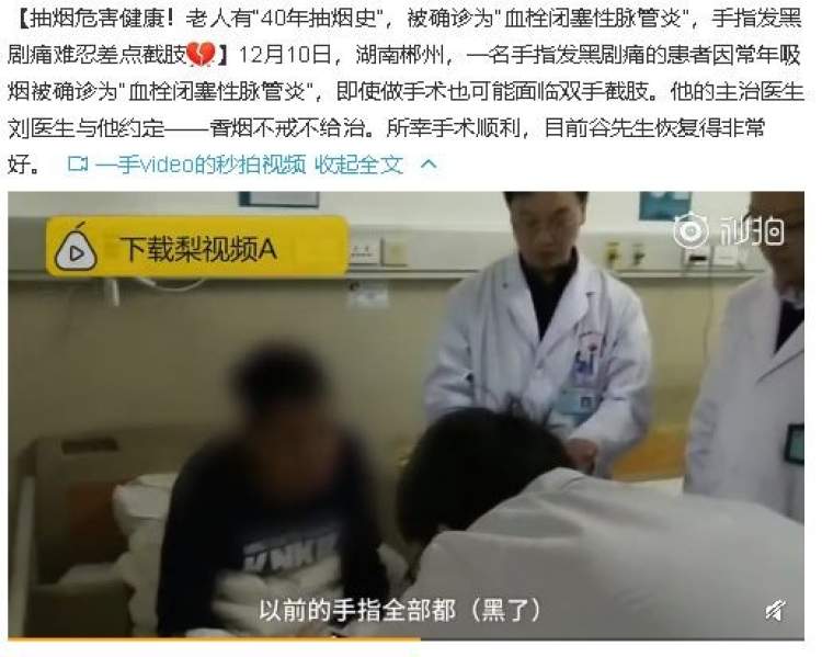 近日,湖南一名手指发黑并伴有剧痛的患者因为吸烟被确诊为“血栓闭塞性脉管炎”,即使做手术也可能面临双手截肢。医生与他约定,香烟不戒绝对不治,所幸手术顺利,目前恢复的非常好。