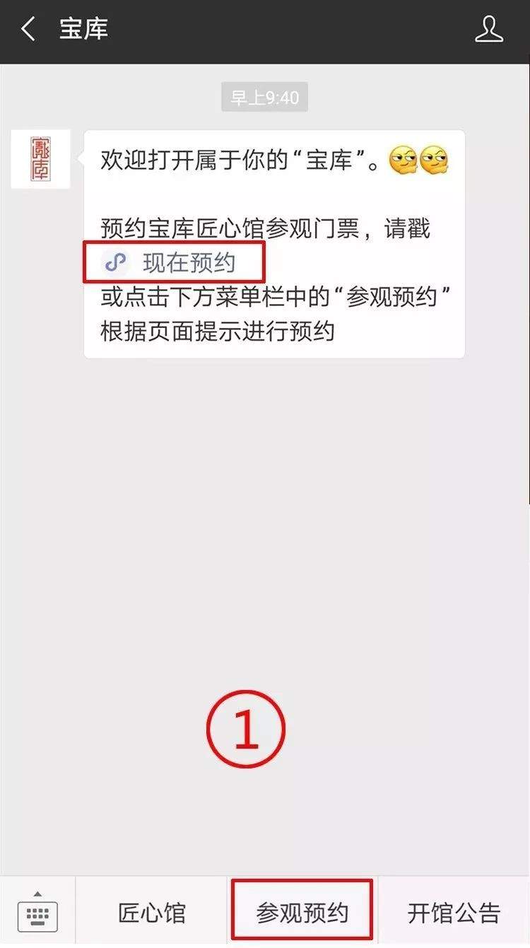 ② 点击公众号自动回复中“现在预约”的链接通道,或点击下方分栏中“参观预约”按钮,自动跳转到宝库匠心馆预约页面。