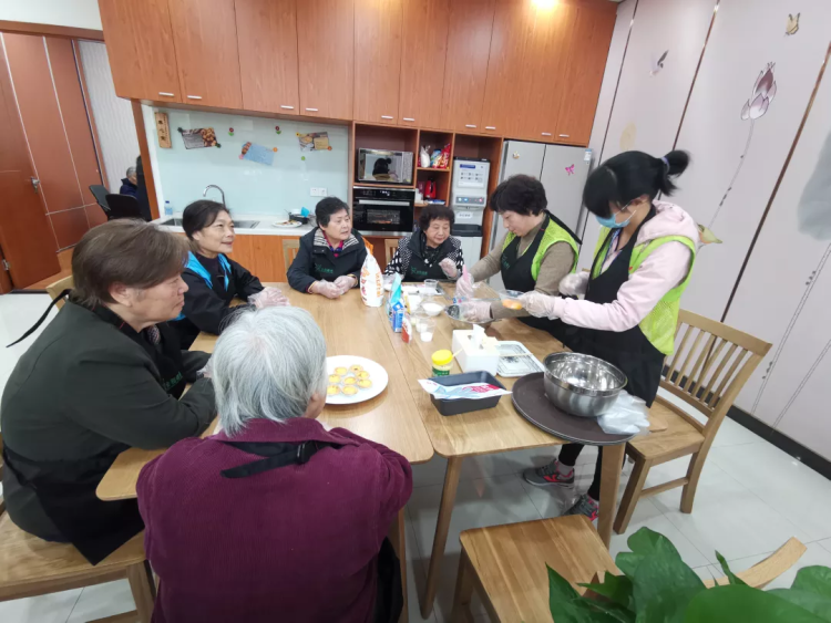 养心堂里,喜欢烘焙的阿姨们正在动手制作着蛋挞,烤箱滋滋作响,空气里弥漫着蛋挞的香味。