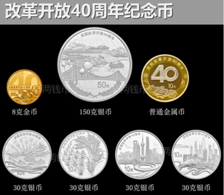 不久前,央行纪念币呈现密集发行,题材丰富,纪念币市场表现开始回暖。其中引人注目的是此次庆祝改革开放40周年的7枚纪念币(见下图)的发行。