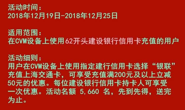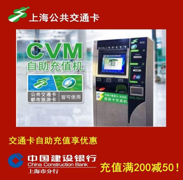 充200减50?!明天起,上海交通卡充值有优惠!限额5660名哦 周到君 2018-12-18 来源:周到上海 周到君从“上海发布”了解到,充值交通卡有优惠啦!上海公共交通卡公司说,12月19日-25日,在CVM设备上使用62开头建设银行信用卡充值,可享受充值满200元及以上立减50元的优惠。每位建设银行信用卡持卡人可享受一次优惠。活动名额5660名,先到先得,送完为止。详见↓ CVM充值操作步骤 来源:周到上海 作者:周到君 赞一个 (0)