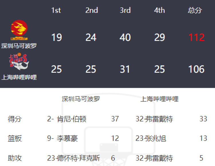 进入第四节后,深圳男篮一度领先达到10分,但上海男篮并没有放弃,弗雷戴特连投带罚单节贡献14分也无济于事。最终,上海男篮106:112客场不敌深圳,遭遇两连败。