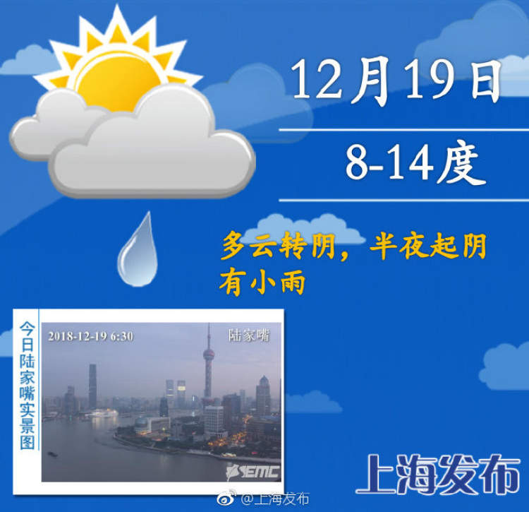 记得带好伞!今夜起多阴雨,最低温明显回升 周到君 2018-12-19 来源:周到上海 小伙伴们!早上好鸭! 周到君早上出门的时候,家里人就千叮咛万嘱咐一定要带好伞。所以今天天气到底怎么样呢?今天起随着暖湿气流增强,申城的雨水将增多。今天白天多云到阴,夜里转阴有小雨,最低气温8度,最高温在14度左右。今天起本市降水过程增多,不过持续时间和降水量均不及本月上旬的连阴雨过程,预计今夜到明天上午和周六的雨势相对明显一些。 气温方面:最低气温还会有显著上升,周四开始能升到10度上下,最高气温相对平稳在13-14度。周五最高气温可达16度,25-26日将有一次较强冷空气过程。 来源:周到上海 作者:周到君 赞一个 (0)