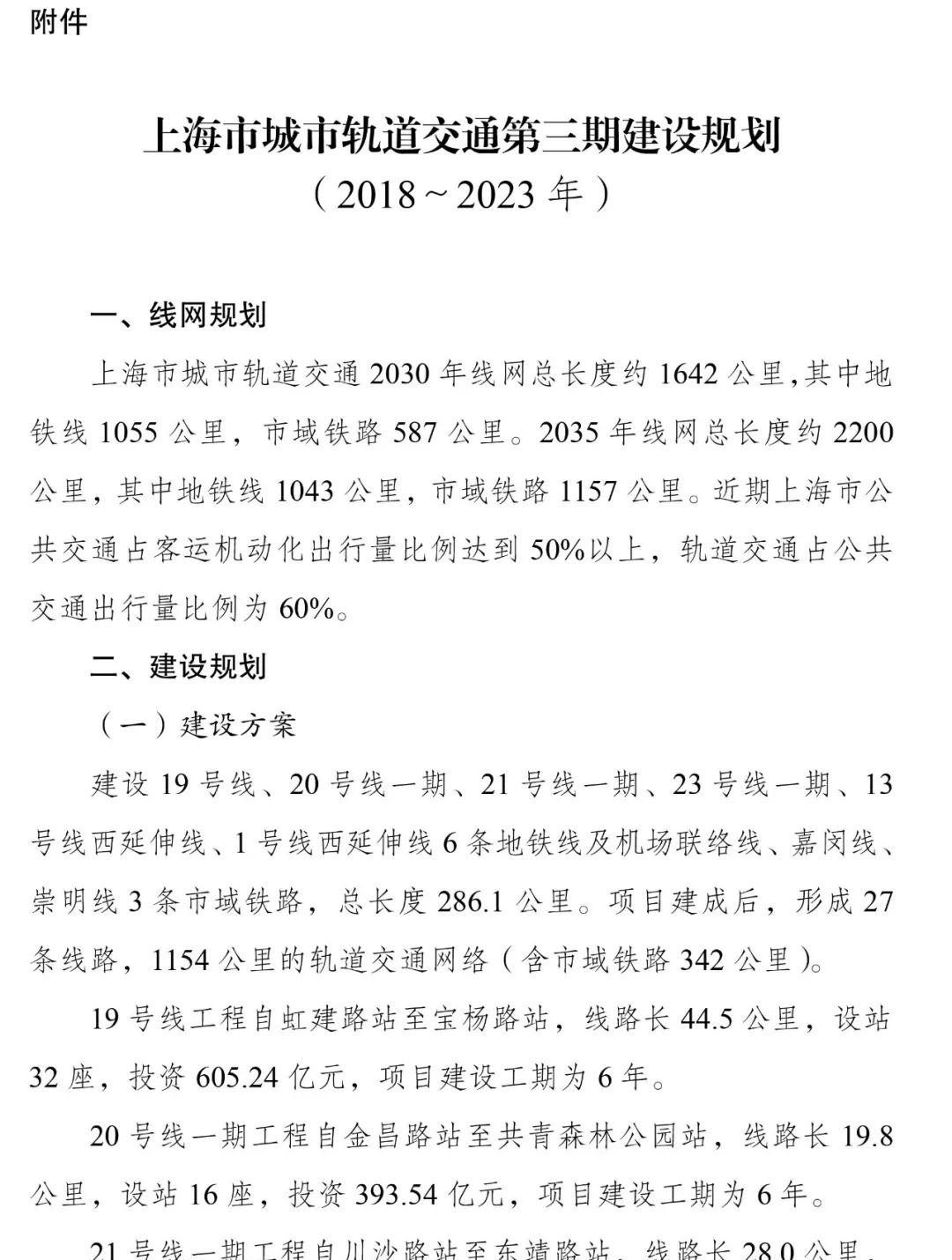 一、为适应上海市新一轮城市总体规划要求,建设卓越的全球城市和社会主义现代化国际大都市,促进城市空间与轨道交通系统的协调发展,同意上海市城市轨道交通第三期建设规划,建设19号线、20号线一期、21号线一期、23号线一期、13号线西延伸线、1号线西延伸线及机场联络线、嘉闵线、崇明线等9个项目,规划期为2018~2023年。
