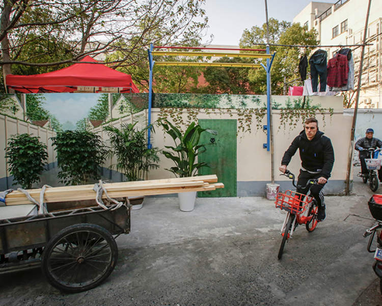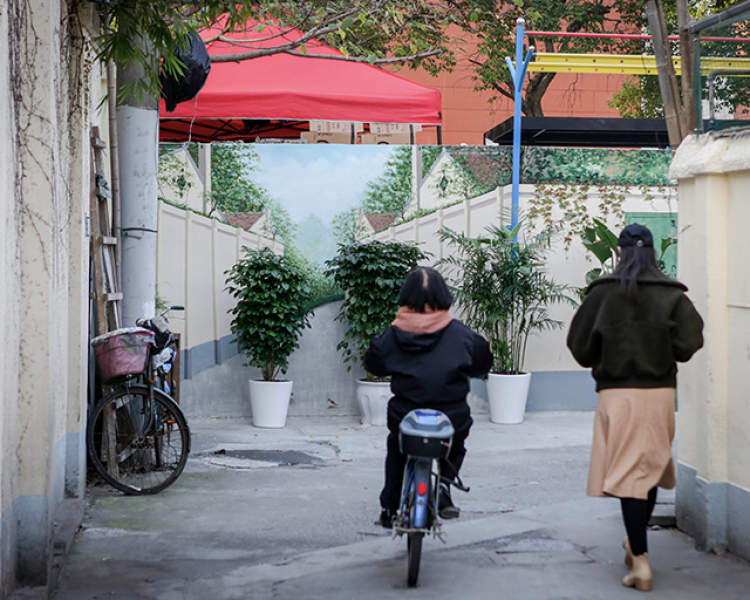 这幅画诞生于我们拆违之后,本意是用壁画美化社区。因为这条路在这个位置由宽变窄,机动车道变成了断头路,所以设计师做了这样的设计。设计师其实可能是希望通过壁画的方式,让这条路有一个在视觉上的延伸。
