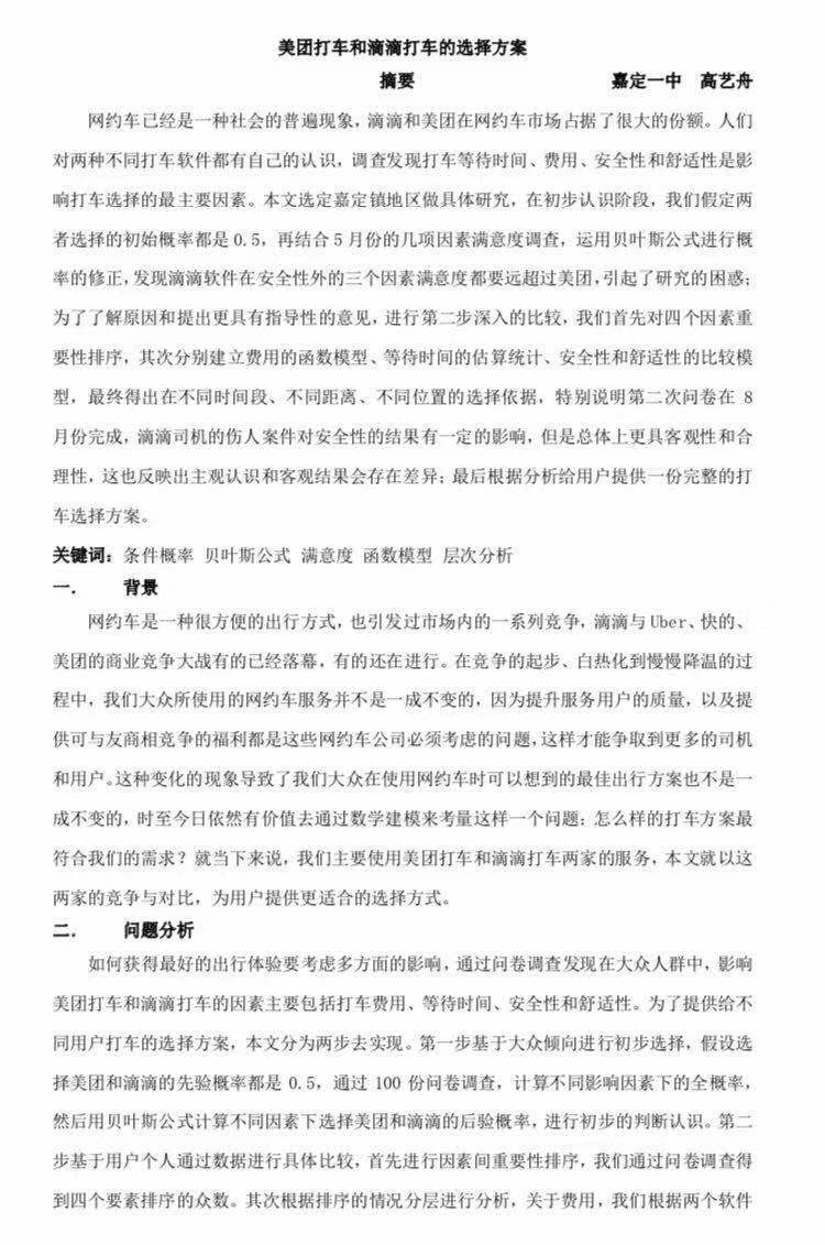 滴滴打车、美团打车,这是目前上海市民使用率很高的两款打车软件,但哪种性价比更高、更容易打到车呢?嘉定一中的一位高二学生高艺舟专门进行了一番研究,他的这篇《美团打车和滴滴打车的选择方案》,还获得了2018年上海市中学生数学知识应用小论文二等奖。
