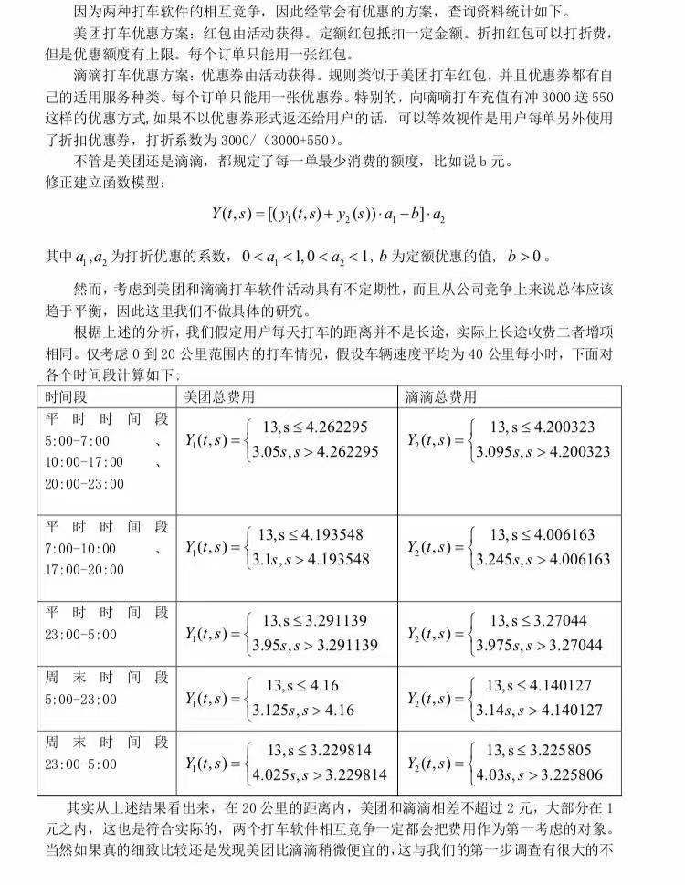 具体而言,比如,关于费用,他根据两个软件费用计算公式得到距离和费用的函数关系式,并结合它们各自的优惠活动进行函数优化。