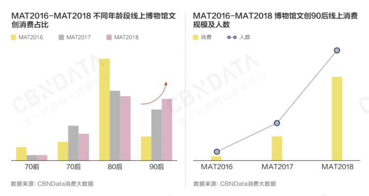 90后为有趣的设计买单,2018年90后在原创文创类消费占比提升至50%以上,“故宫博物院”为最受 90后欢迎文创品牌,近一年博物馆文创消费规模增幅超过两倍。