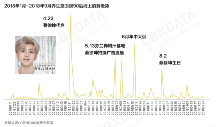 90后消费者也更愿意为偶像的代言产品买单。以蔡徐坤为例,对于其代言品牌养生堂销售拉动效果明显。