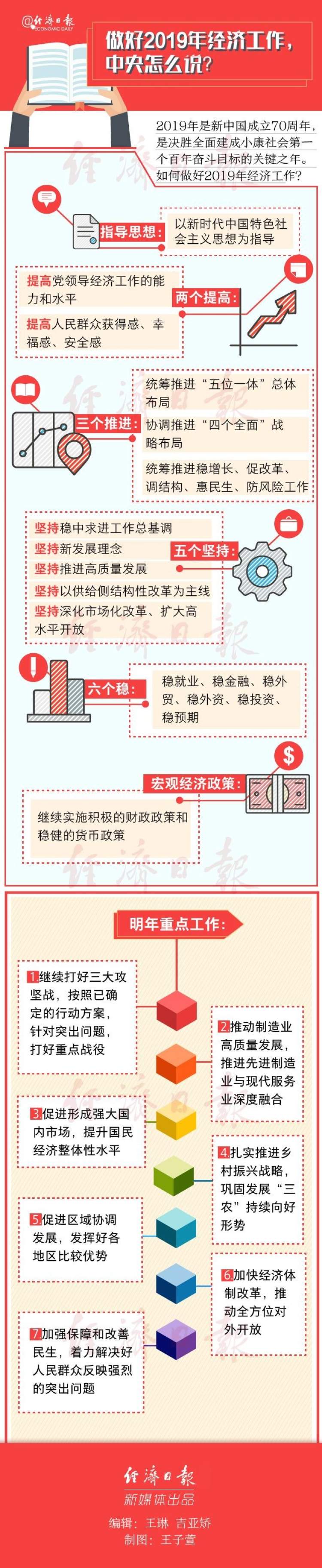 做好2019年经济工作,中央怎么说? 2018-12-20 来源:经济日报 2019年是新中国成立70周年,是决胜全面建成小康社会第一个百年奋斗目标的关键之年。2019年经济工作重点将围绕哪些方面展开,成各界关注焦点。 2018年12月13日,习近平主持召开中共中央政治局会议,分析研究2019年经济工作。12月11日,习近平主持召开中共中央党外人士座谈会,就今年经济形势和明年经济工作听取各民主党派中央、全国工商联负责人和无党派人士代表的意见和建议。这两个会议已透露很多信息。 2019年经济工作怎么干?看图↓ 赞一个 (0)