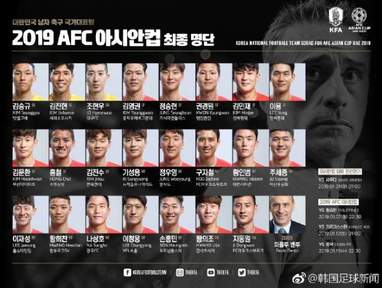 北京时间12月20日,中国队在2019亚洲杯小组赛中的对手韩国队正式公布了23人大名单。这份大名单由目前状态大火的“亚洲天王”孙兴慜领衔,除此之外,寄诚庸、李青龙、黄喜灿等旅欧球员及效力中超的金英权、权敬源等人悉数在列。