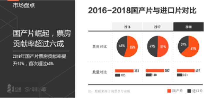 2018年,院线上映的电影总量为499部,与去年持平,其中国产电影为382部、进口片为117部。在国产片总量基本不变的情况下,2018年国产片票房占比从51%提升到63%,票房贡献率首次超过六成。中国电影市场对进口片的依赖性逐渐减弱,《我不是药神》、《红海行动》等国产优质口碑制作越来越受到青睐,成为国民级现象。
