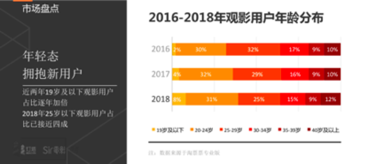 灯塔报告显示,近年来,电影产业市场不断增长,呈现“年轻态”趋势,越来越多年轻观众走进影院;2018年,19岁及以下观影用户市场占比8%,连续三年翻番增长。