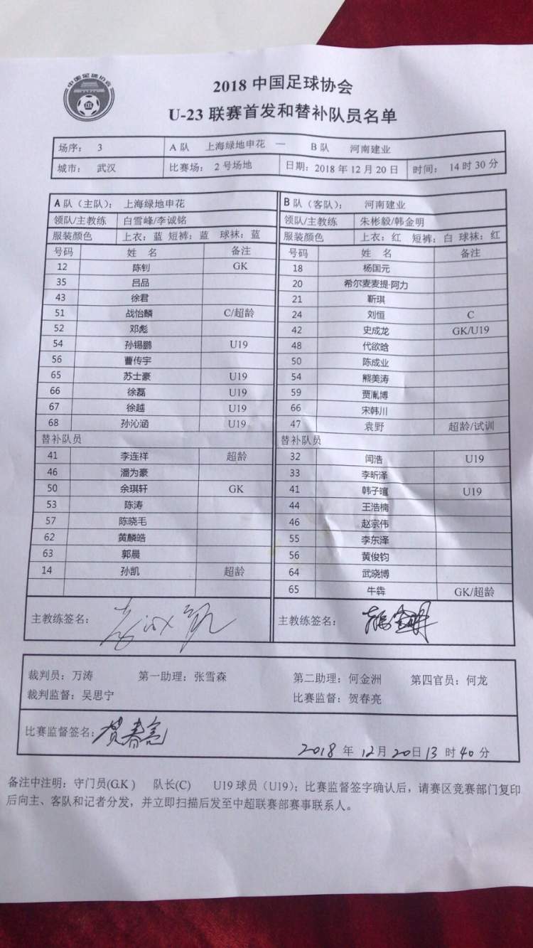 虽然进入到了争冠组阶段,比赛是淘汰赛的赛制,但是申花U23队教练组依然坚持使用年轻队员,首发派上了5名U19队员,包括增补进入名单的孙锡鹏。本场比赛,首发的守门员是陈钊,其他10名首发队员分别是:吕品、徐君、战怡麟、邓彪、孙锡鹏、曹传宇、苏士豪、徐磊、徐越和孙沁涵。