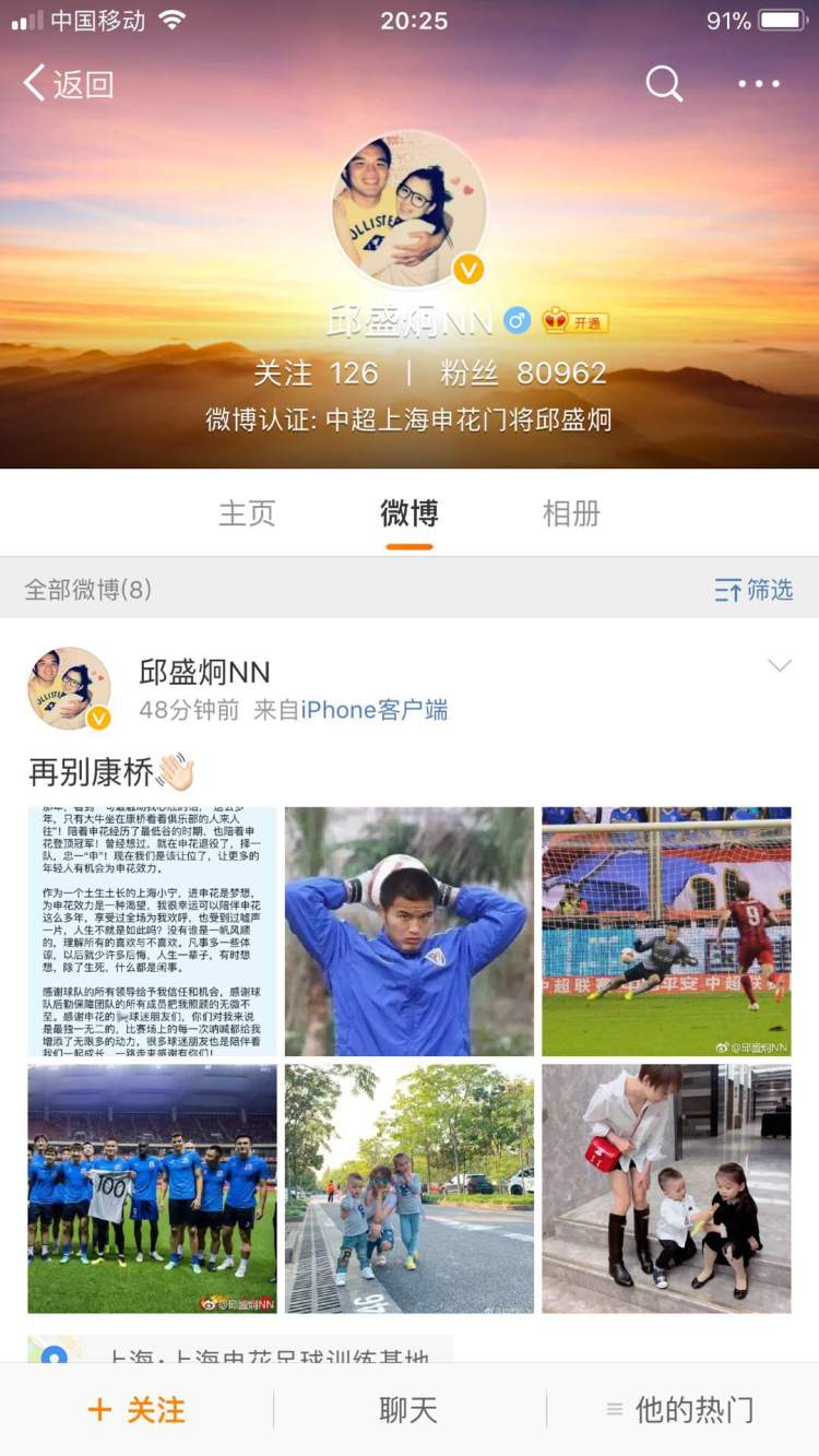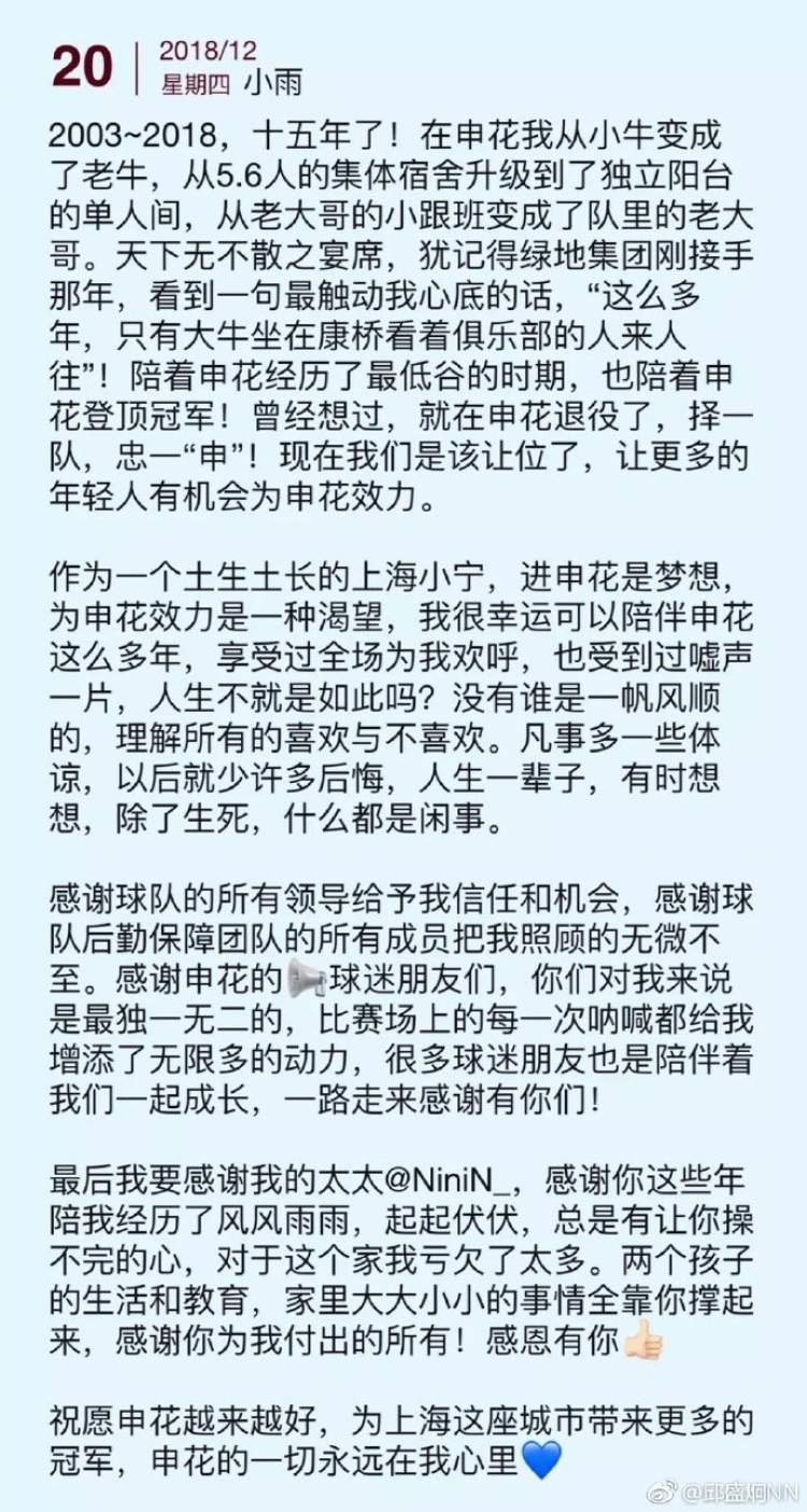 今天晚上,邱盛炯发了条朋友圈——再别康桥。邱盛炯写道:2003-2018,十五年了!在申花我从小牛变成了老牛,从五六人的集体宿舍升级到了独立阳台的单人间,从老大哥的小跟班变成了队里的老大哥。天下没有不散之筵席,犹记得绿地集团刚接手那年,看到一句最触动我心底的话,“这么多年,只有大牛坐在康桥看着俱乐部的人来人往!”陪着申花经历了最低谷的时期,也陪着申花登顶冠军!曾经想过,就在申花退役了,择一队,忠一“申”!现在我们是该让位了,让更多的年轻人有机会为申花效力。