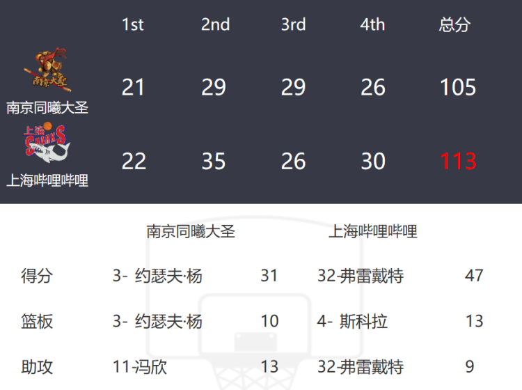 关键时刻,大鲨鱼再遭减员,奥斯汀挥肘击开了孟令源眼角,裁判在回看录像后判罚奥斯汀违体犯规,罗汉琛执行罚球全部命中,下一回合又是他的绝命三分帮助球队将分差拉开至了5分。最终,上海男篮以113:105战胜同曦男篮,止住两连败颓势。下一轮联赛,上海男篮将继续客场之旅,对阵由王哲林领衔的福建男篮。