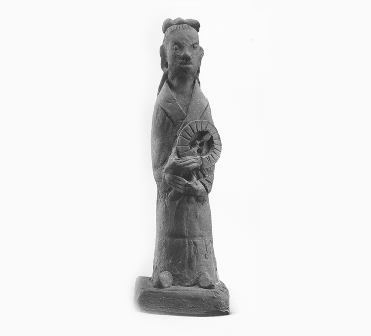 上图是南宋·执罗盘陶俑(原件),底座长5.5厘米、宽5厘米、高16.8厘米,宁波中国港口博物馆馆藏。陶俑手执罗盘,罗盘有明显的表示刻度的条纹,其上贴塑指针,作左右指向。此陶俑证明早在宋代,我国就已使用罗盘确定方位。这件罗盘中间的磁针形状和水浮磁针不同,中央有一明显圆孔,应该是轴承结构。有学者因此认为,在宋代我国已有了旱罗盘。