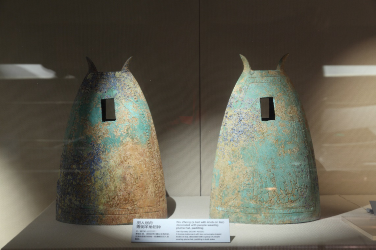 还有汉·羽人划舟纹羊角铜钮钟(见上图)。它是青铜乐器。钮钟上小下大,呈宝塔状,较一般钮钟体型稍大。